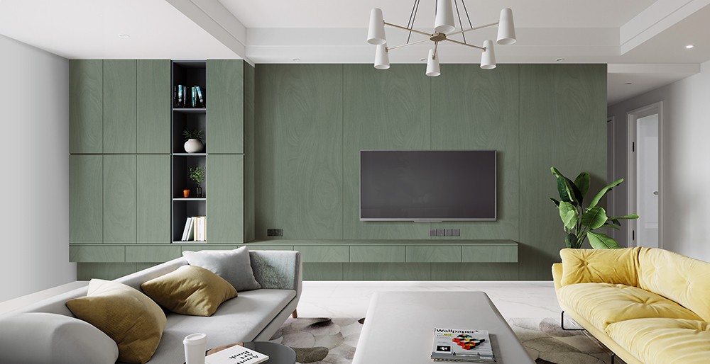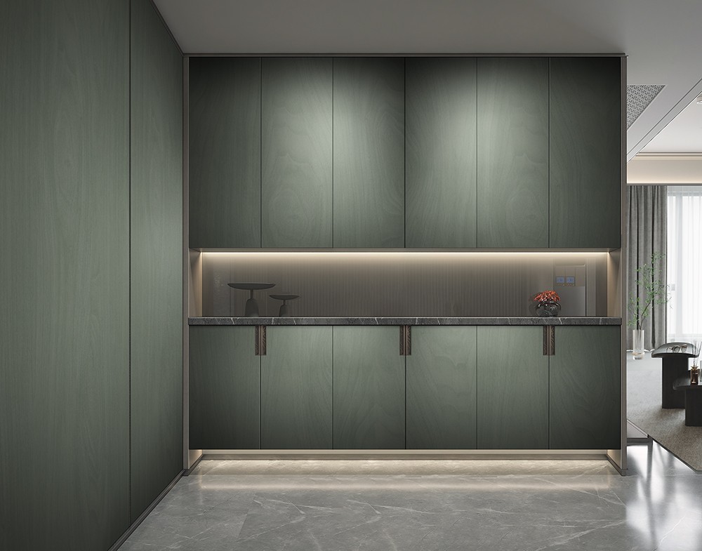 猶如微風輕拂樹葉的觸感,綠意中隱約交織著細緻的木紋,如詩如畫。像是大自然的低語,是木林的秘密,為整個空間帶來自然與溫暖,讓心靈感到悠然。
